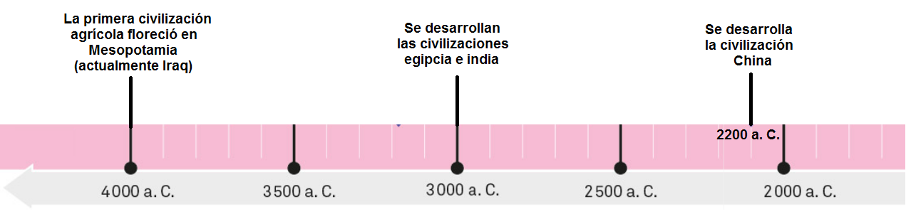 “La primera civilización agrícola floreció en Mesopotamia (actualmente Iraq) hacia el año 4000 a. C. Las civilizaciones egipcia e india se desarrollaron hacia el 3000 a. C. y la china cerca del año 2200 a. C. […].” (Historia. Sexto grado, p. 34)